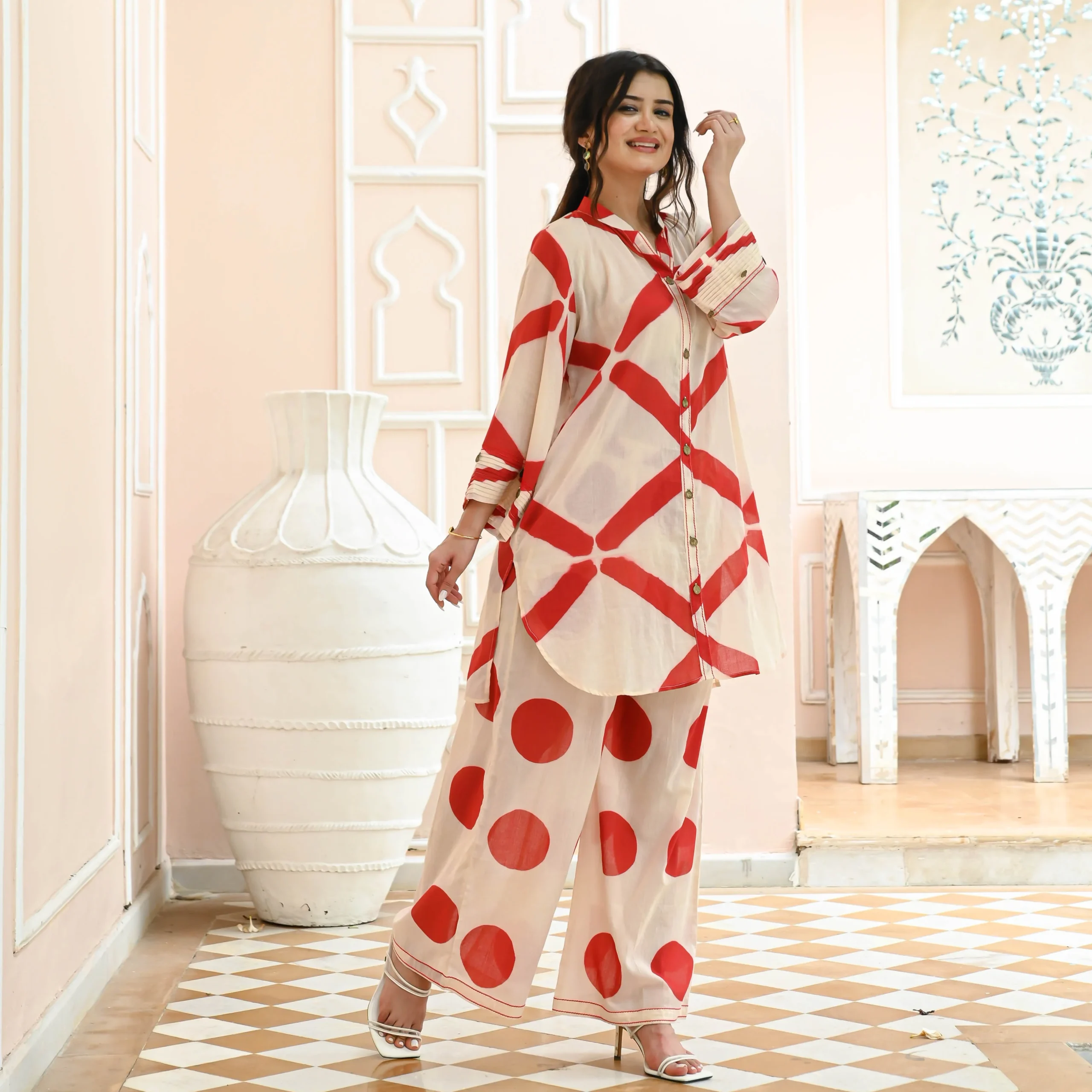 Get ready to make a style statement with our Nirupa Clamp Co-ord Set. Crafted from luxurious off-white cotton fabric, this ensemble boasts a chic button-down kurta, combining comfort and elegance effortlessly. Adorned with a striking red geometric print, it infuses a modern and eye-catching touch into your look, making it a standout choice for a variety of occasions.