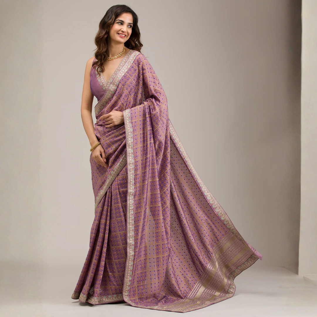 Step into the spotlight with Koskii’s stunning purple saree, crafted from the softest raw silk and adorned with eye-catching golden zariwork. This piece captivates with its vibrant color and luxurious feel, perfect for evenings where you want to express your style uniquely and elegantly.